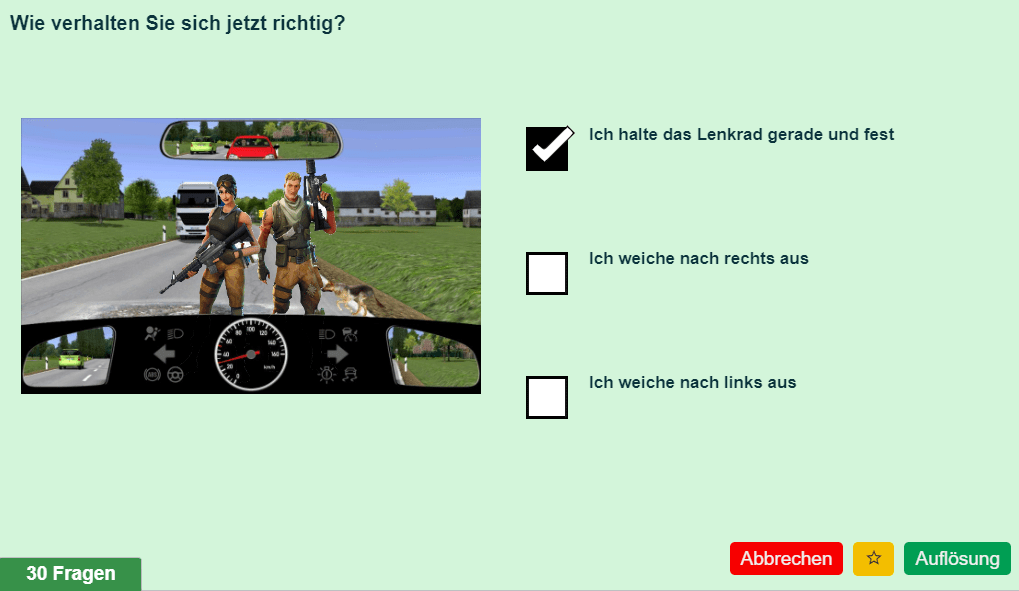 Anstatt also unter deinen negativen gefühlen zu leiden, solltest du ihnen dankbar sein. Die geschwindigkeitsregelanlage (tempomat) ihres kraftfahrzeugs ist auf 130 km/h eingestellt. Kӧln liegt in nordrhein — westfailen. _ länger ich über sein verhalten nachdenke, _ wütender. Ich überhole das neben mir fahrende fahrzeug und wechsle den fahrstreifen. Testberichte es wurden 6 führerscheinlernportale getestet, davon 2 mit dem ergebnis gut. Die ampel blinkt gelb, dass bedeutet, sie ist nicht eingeschaltet. Ich weiche nach rechts aus rechts neben der fahrbahn ist eine böschung. Wie verhalten sie sich jetzt richtig : Wie verhalten sie sich hier richtig? Ich ermögliche der fußgängerin auf der rechten seite das überqueren der fahrbahn. Ich habe jetzt wenig zeit. Wie müssen sie sich bei diesem verkehrszeichen verhalten?